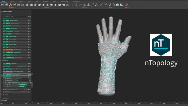Finally, Owen showed how to make a fixation bracket after he hurt his wrist when he was riding a bicycle previously. He scanned his front arm and palm with Einstar and imported the digital twin into nTopology to generate Thiessen Polygons and make some adjustments. Lastly, he 3D printed the product with TPU and fit it into his hand.