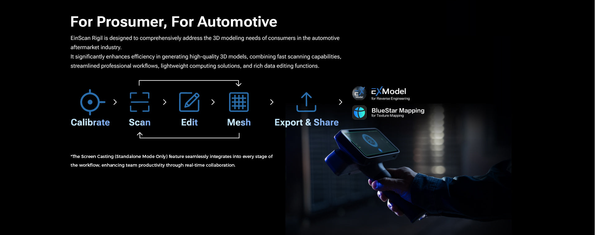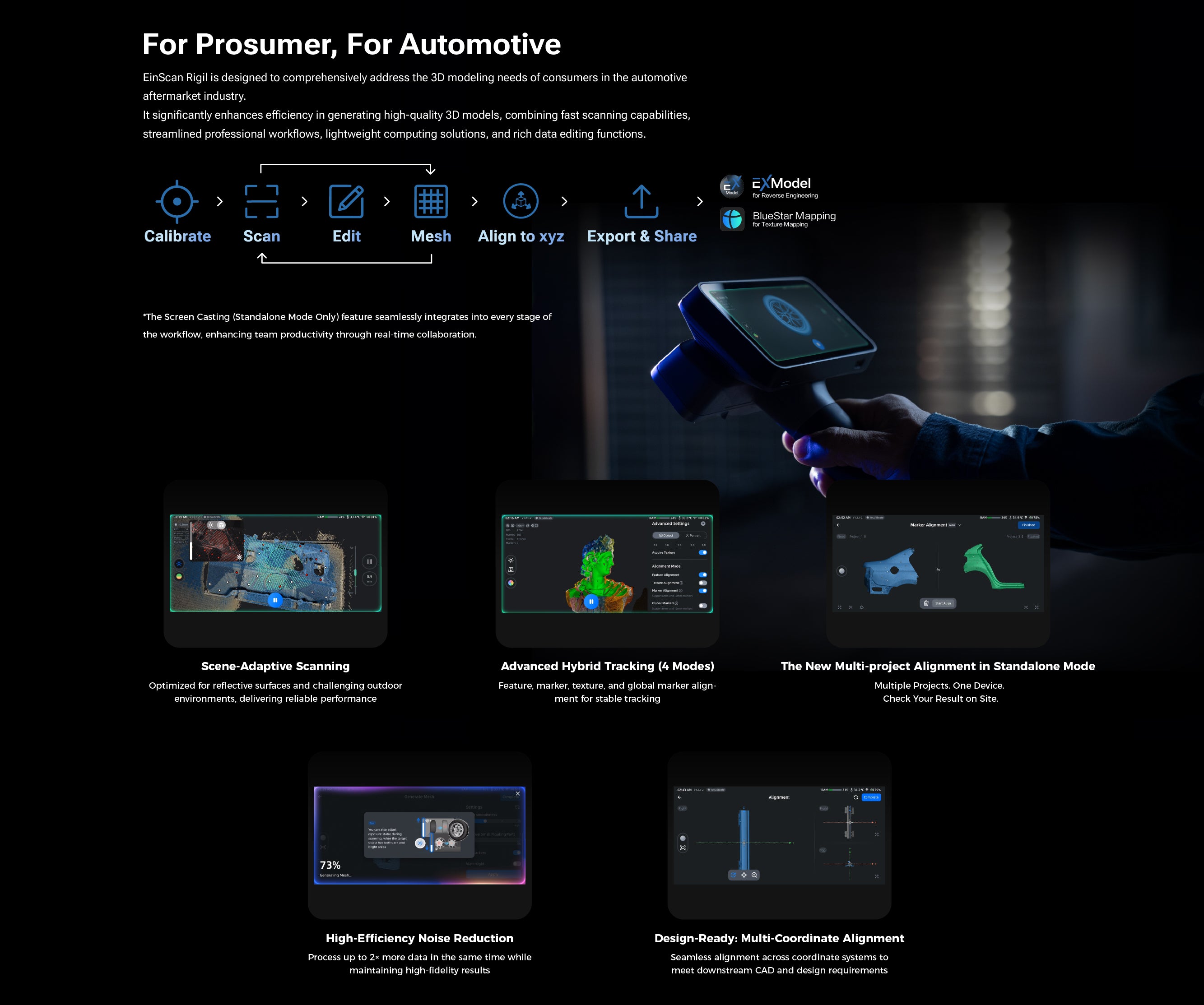 EinScan Rigil is designed to comprehensively address the 3D modeling needs prosumers in automotive aftermarket. It significantly enhances efficiency in generating high-quality 3D models, combining fast scanning capabilities, streamlined professional workflows, lightweight computing solutions, and rich data editing functions.