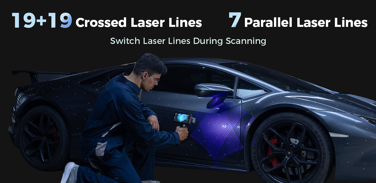 EinScan Rigil's 9 cross laser lines and 7parallel laser lines are switchable during scanning process, and data captured by each mode can be merged together, to achieve speed and detail in one scanning project