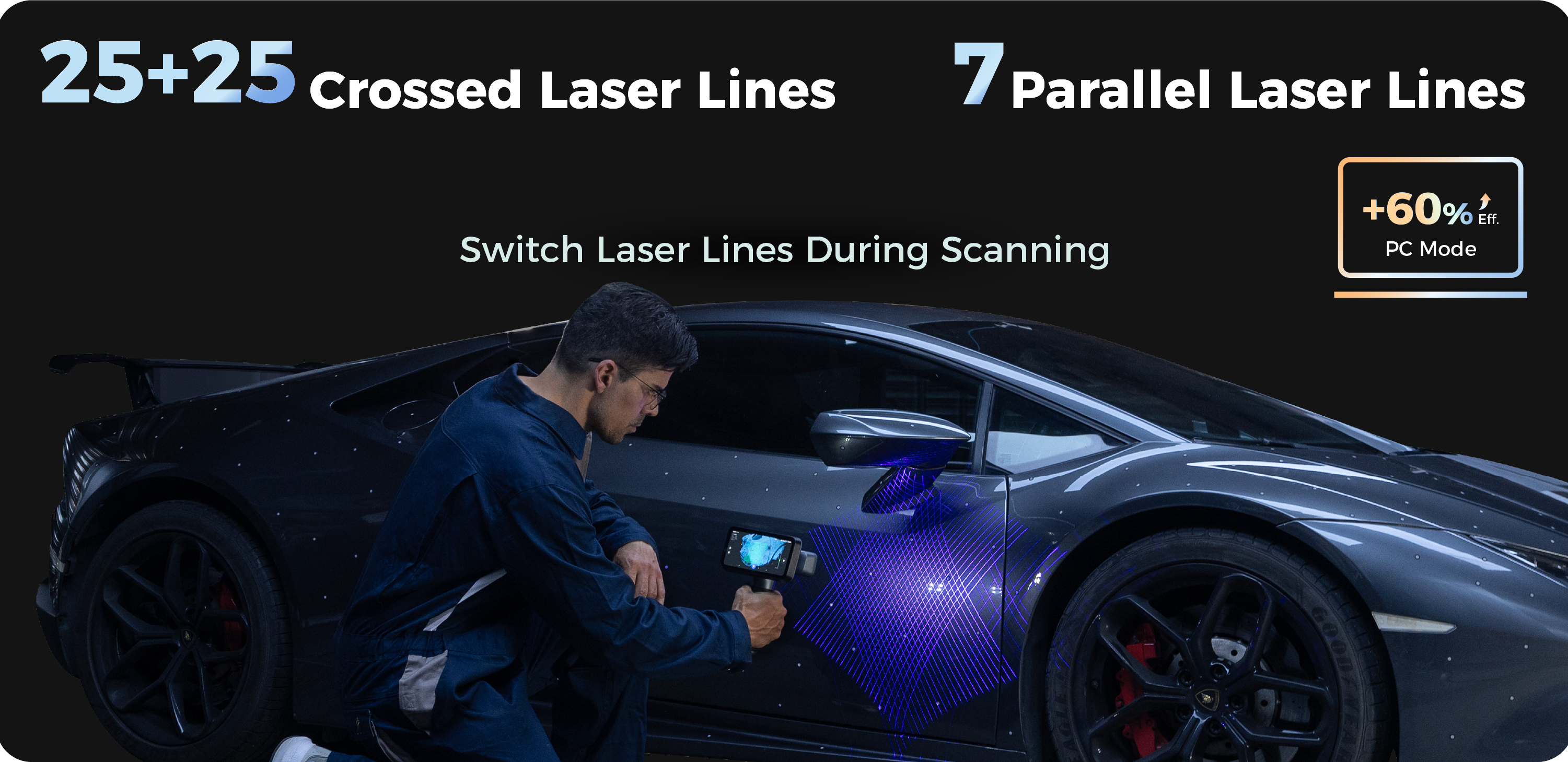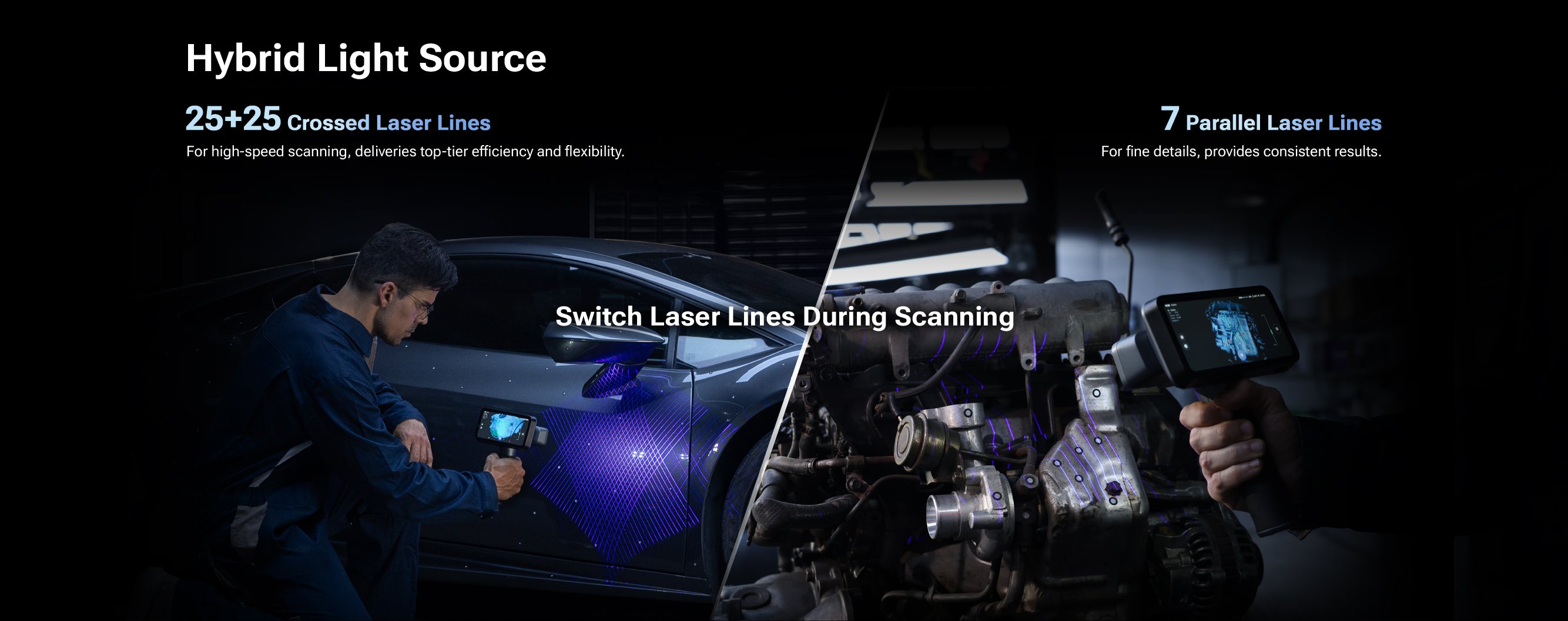 EinScan Rigil's 25+25 cross laser lines and 7parallel laser lines are switchable during scanning process, and data captured by each mode can be merged together, to achieve speed and detail in one scanning project