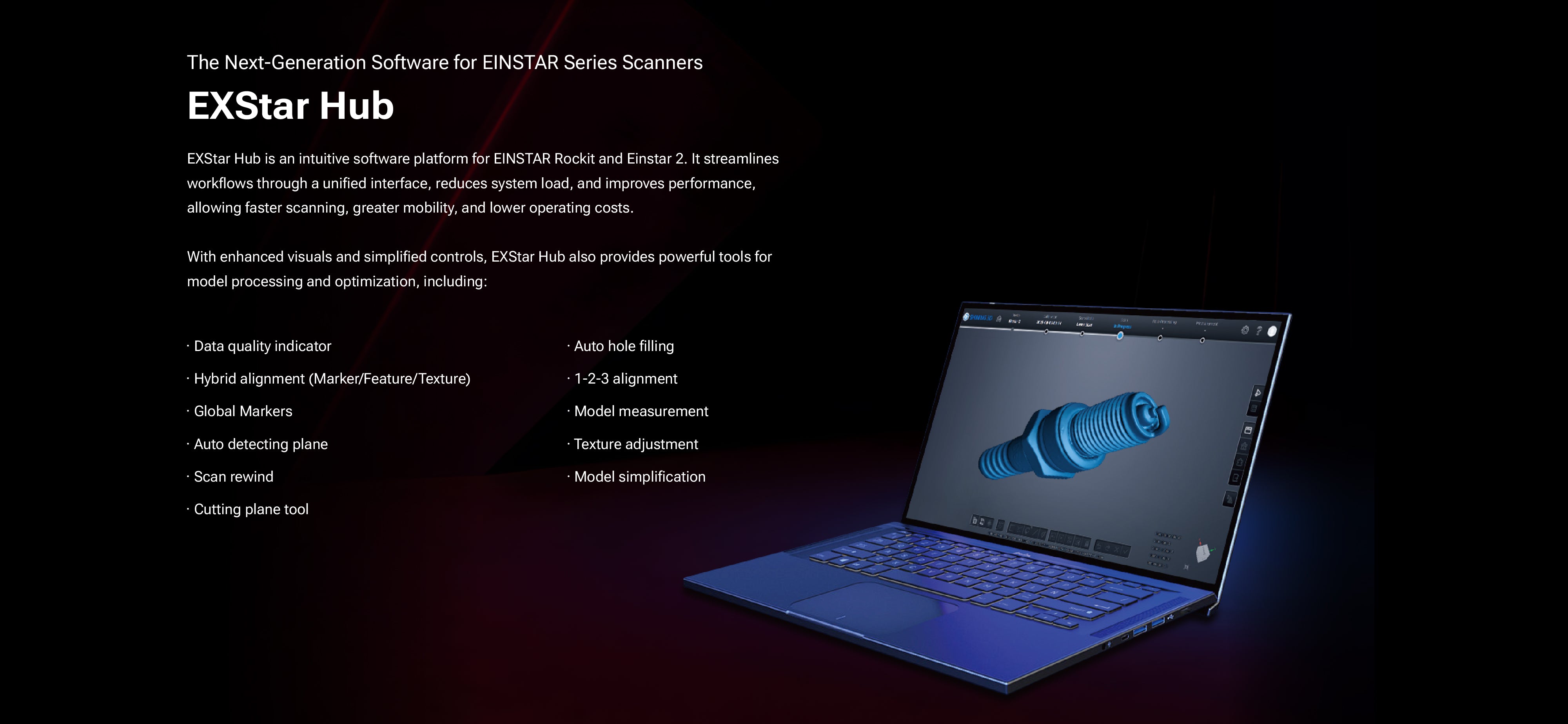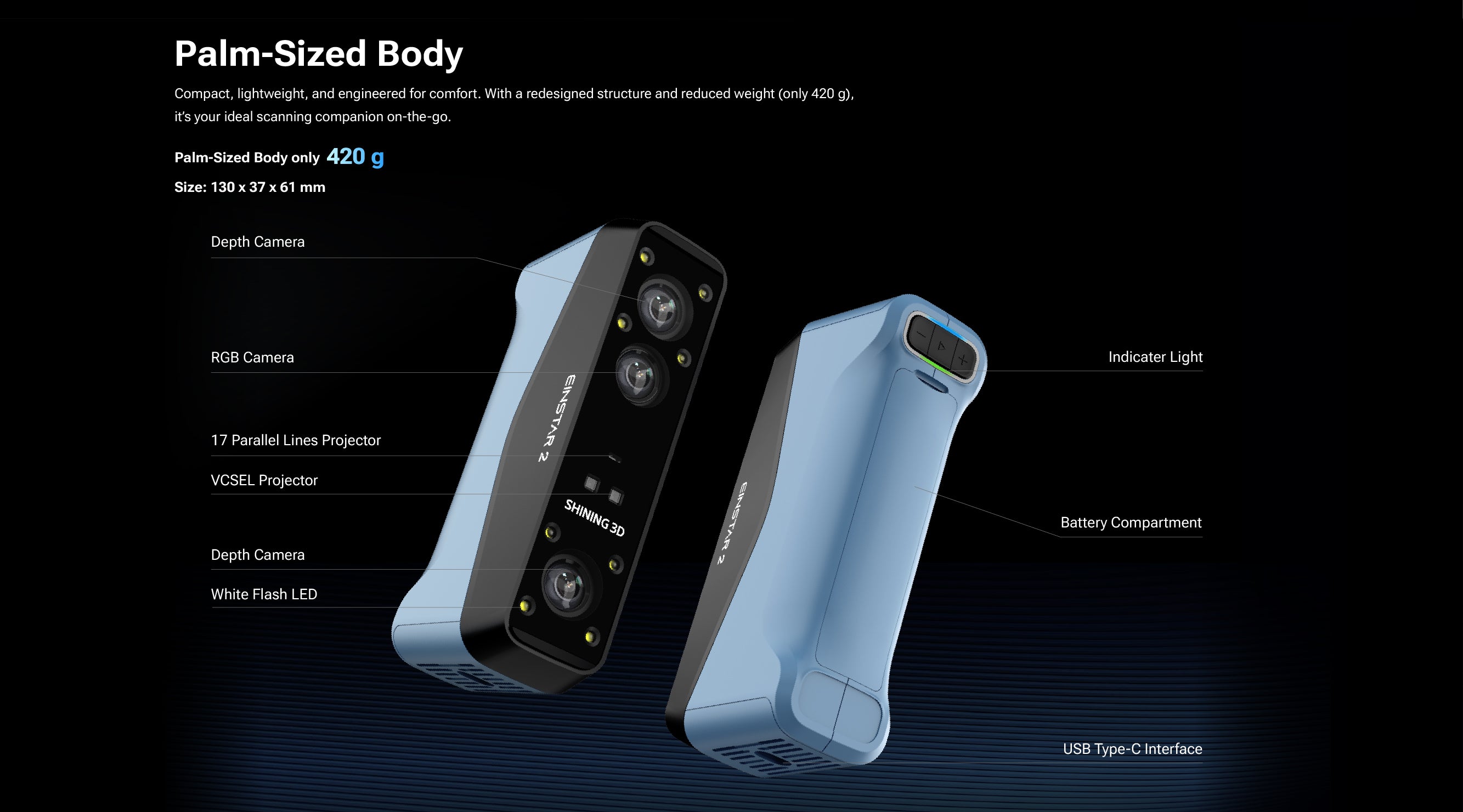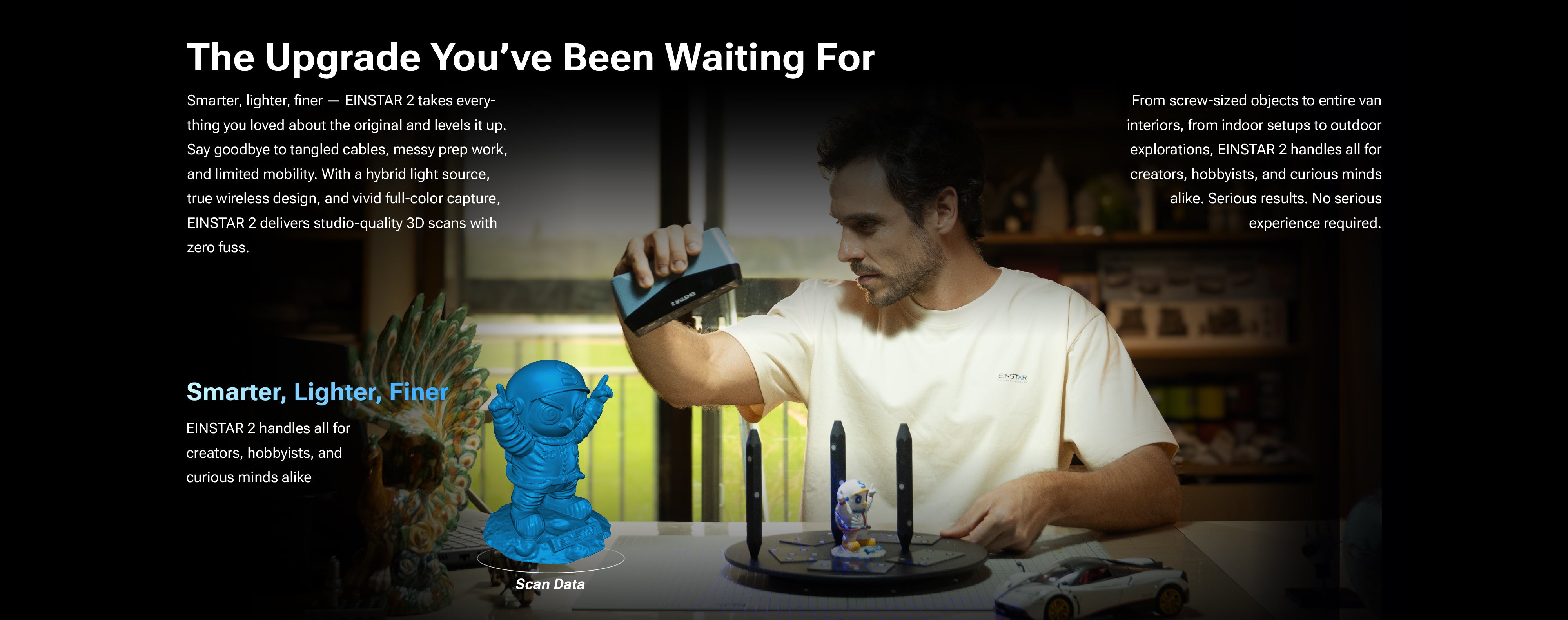 The EINSTAR 2 is a major step up from the original. It introduces a new laser mode for capturing finer details on small objects and can handle reflective surfaces without spray. The tracking in IR mode is even better, and the true wireless design offers greater flexibility. Furthermore, the new software delivers dramatically faster processing speeds and many other refined features to explore.