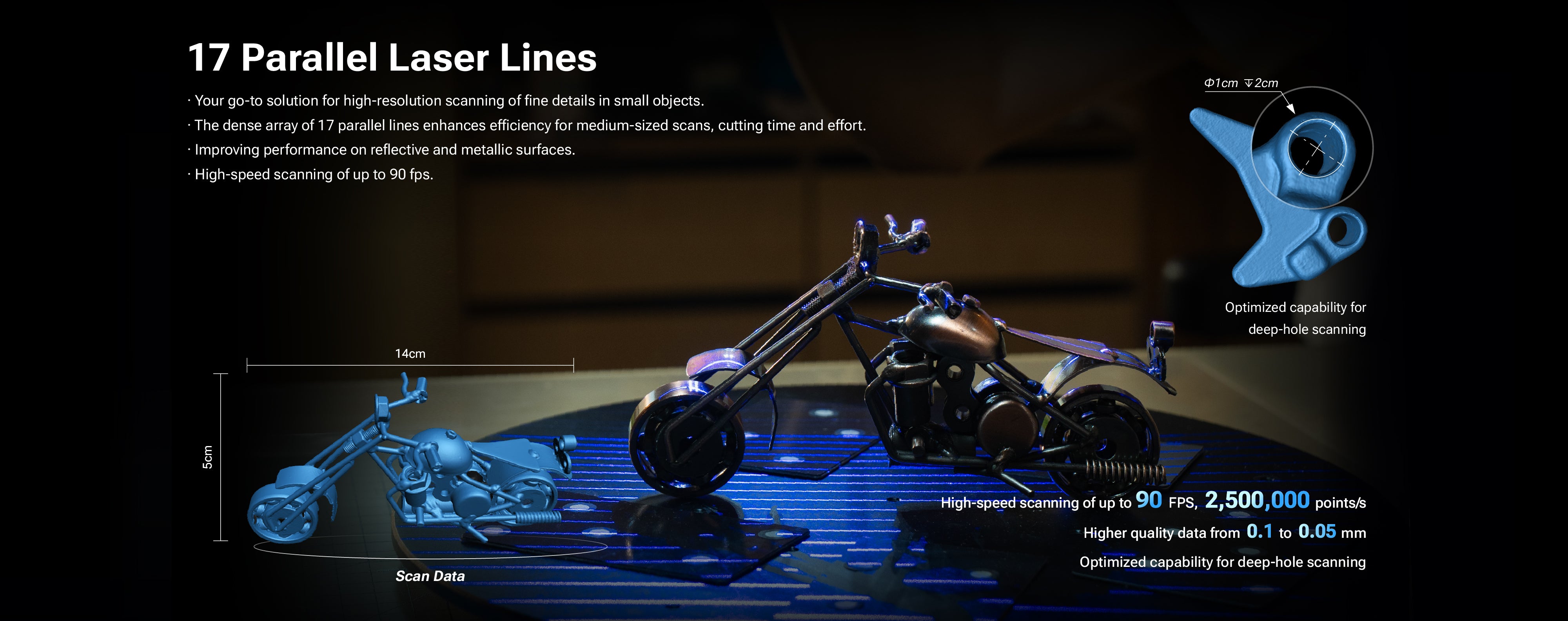 The 17 parallel laser lines represent another innovation from SHINING 3D, striking an optimal balance between speed and detail. Compared to a 7-line pattern, it captures sufficient detail quality while expanding the effective scanning range to cover medium-sized objects, completing such scans much faster. This design positions itself as a cost-effective solution between parallel-line and crossed-line systems. Ultimately, it grants the EINSTAR 2 a versatile scanning capability comparable to that of scanners equipped with multiple dedicated laser sources.