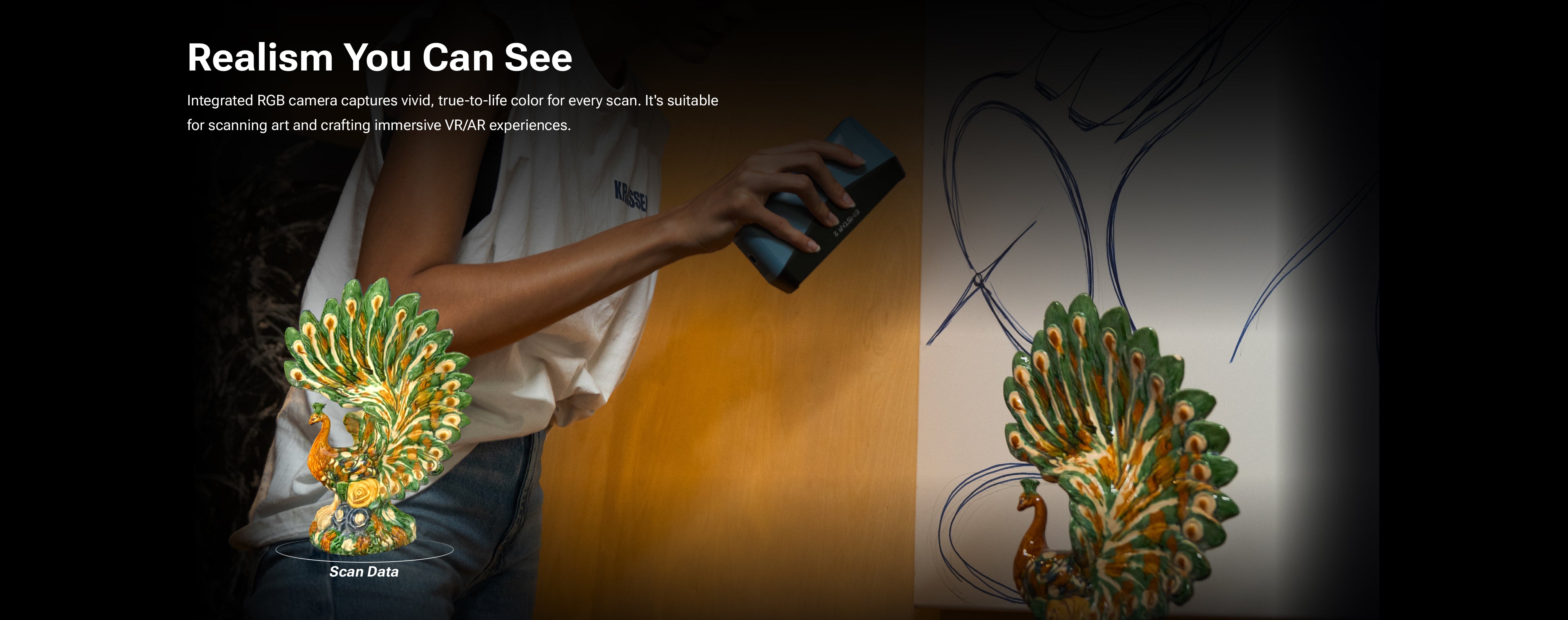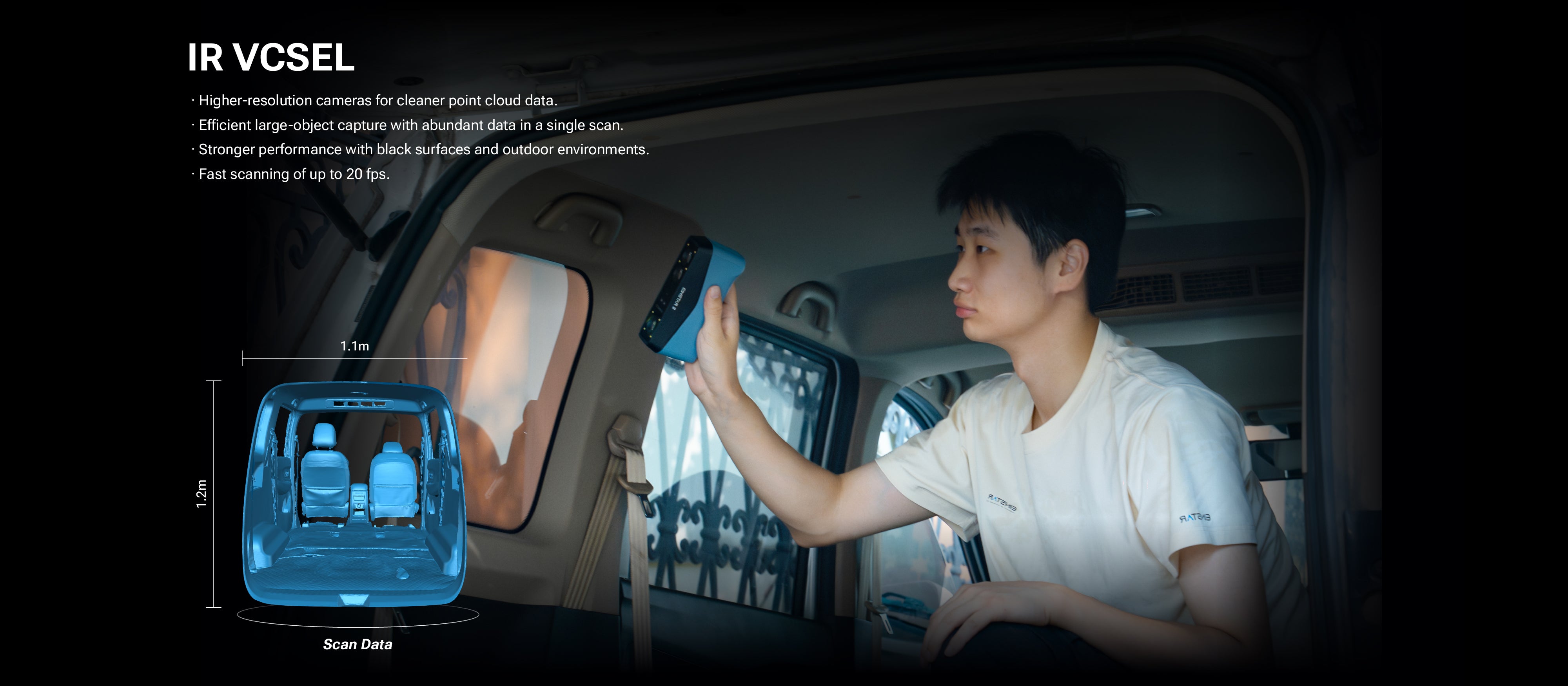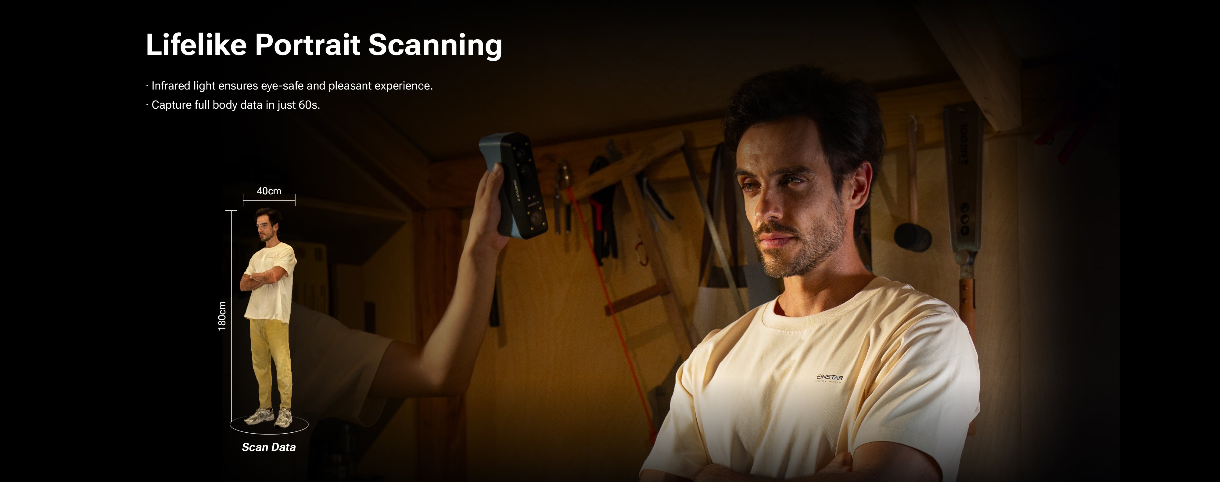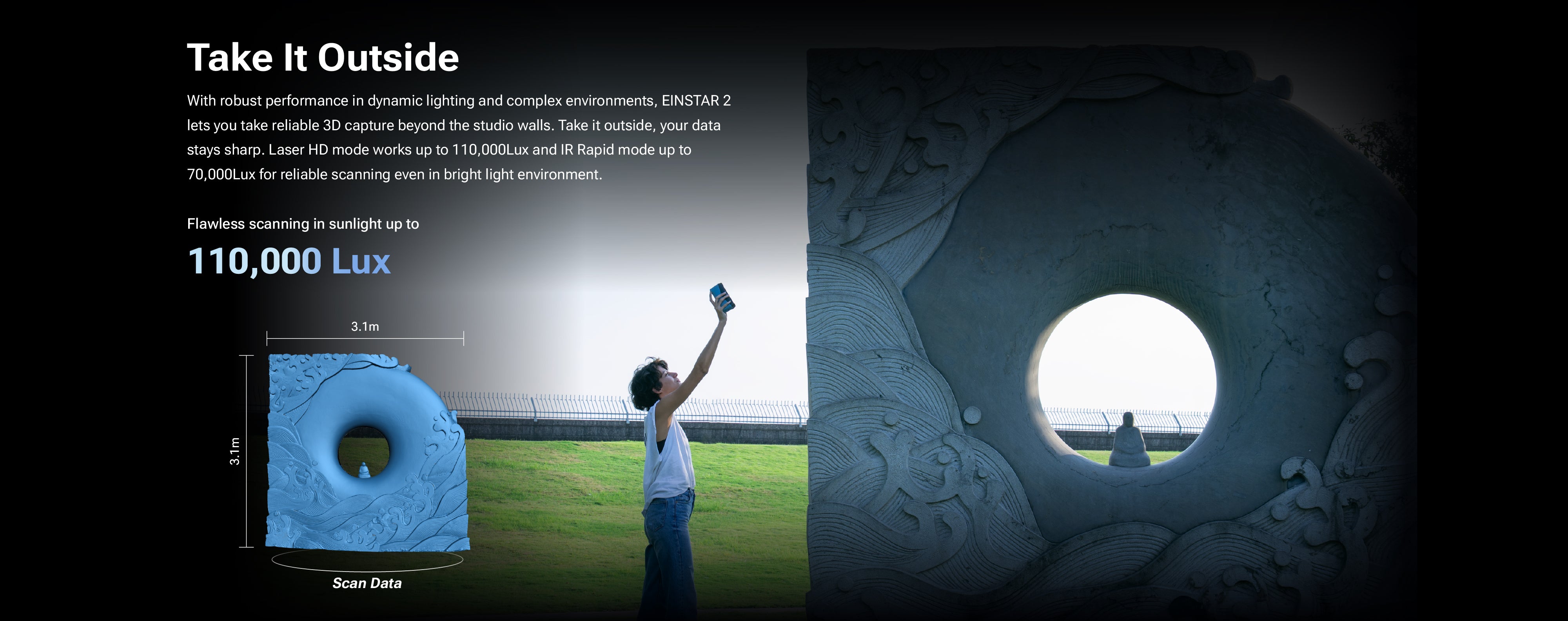 From tiny details (5mm) to large scenes (10m), EINSTAR 2 can handle it. It switches between two modes: the laser mode for small to medium objects and the infrared mode for large object and expansive areas. This flexibility allows it to tackle most materials lik eblack or reflective surfaces.