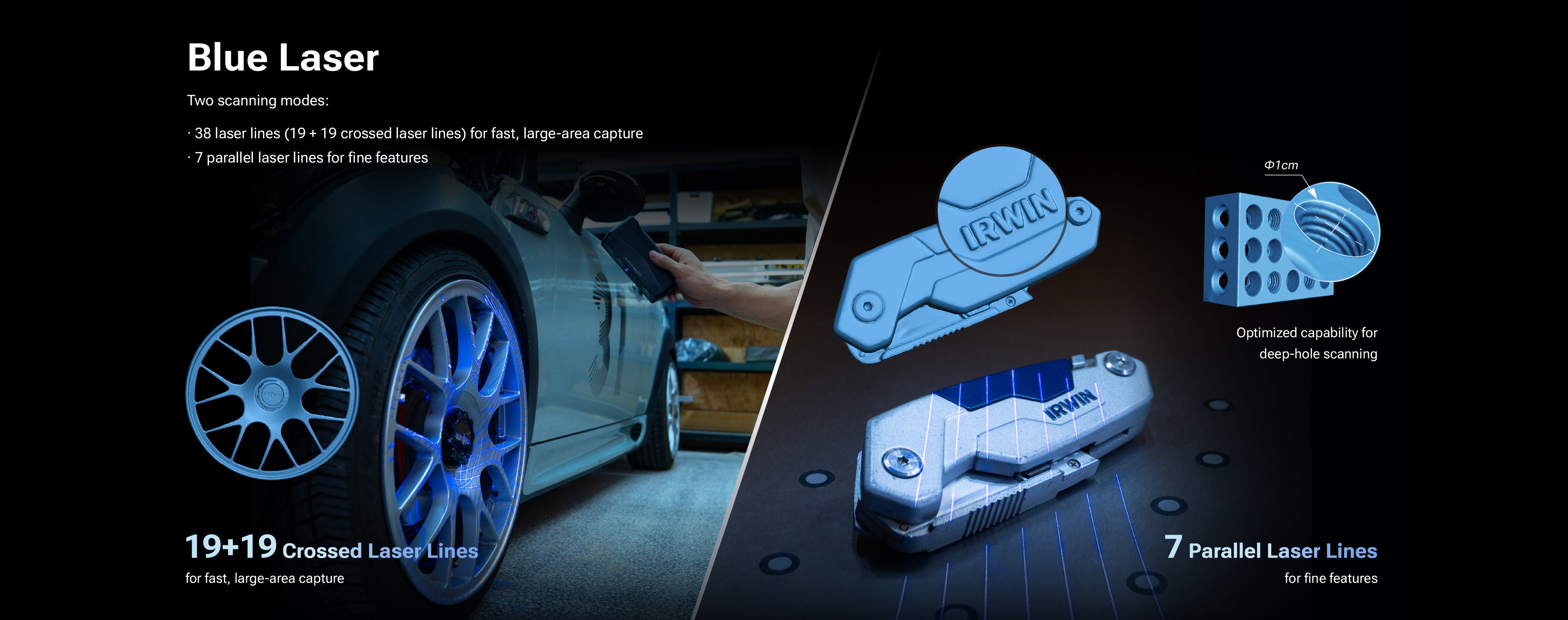 Rockit supports Marker-free laser scanning in both crossed and parallel lines, aligning data via feature recognition to simplify workflow and improve efficiency. It also supports marker-based alignment for objects with few surface features in laser mode. IR mode of Rockit support Hybrid align includes feature, texture and marker tracking for different objects.